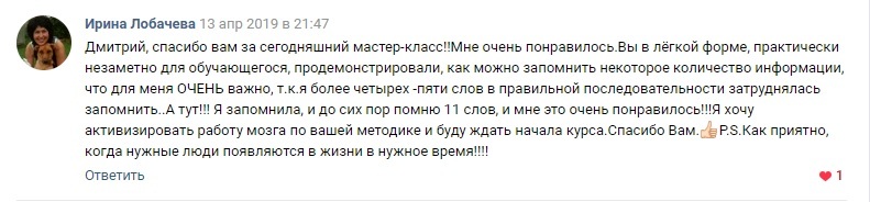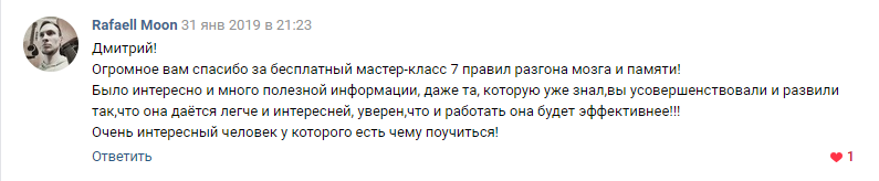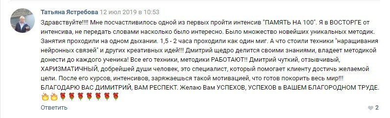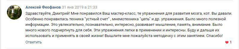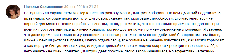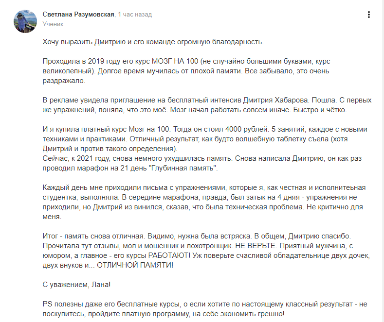 Меня зовут Дмитрий Хабаров. Я ОСНОВАТЕЛЬ ШКОЛЫ ПО УЛУЧШЕНИЮ РАБОТЫ МОЗГА И ВЕДУЩИЙ ТРЕНЕР ПО УЛУЧШЕНИЮ ПАМЯТИ И ДРУГИХ КОГНИТИВНЫХ ФУНКЦИЙ МОЗГА. Я учу практическим техникам по развитию памяти, концентрации и внимания, которые можно и нужно применять в повседневной жизни. Я автор двух книг, ставшими бестселлерами на книжных маркетах: "Рабочий мозг" и "Марафон улучшения памяти". Мои ознакомительные семинары посетило более 114500 человек, а количество студентов полных программ больше 13900 человек. Все они улучшили память, концентрацию и внимание. Предлагаю этот результат и Вам. |